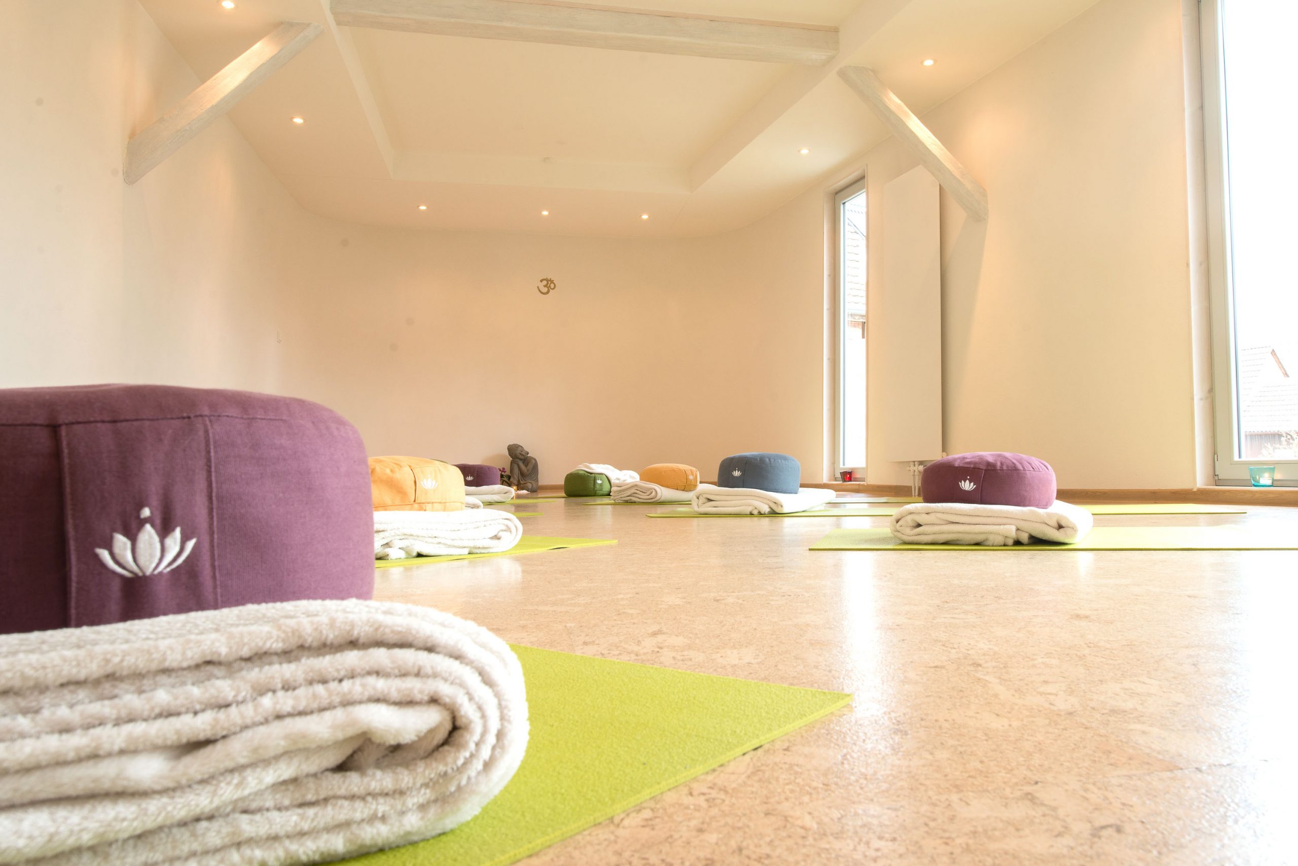 Im Eingangsbereich ist Platz sich umzuziehen und gemütlich eine Tee zu trinken. Der große Seminarraum im 1. OG ist mit ca.60qm Korkboden, WC und Dusche ausgestattet. Yogamatten, Kuscheldecken und  Meditationskissen/ Bolster  sind für mind. 12 Teilnehmer vorhanden. Der untere  Praxisraum ist 46 qm groß und hat eine Fussbodenheizung.